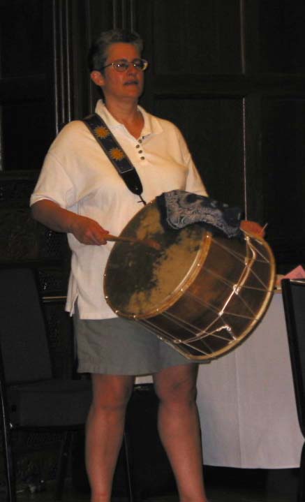 Myra beats out rhythm in 11/16 on the tupan.