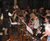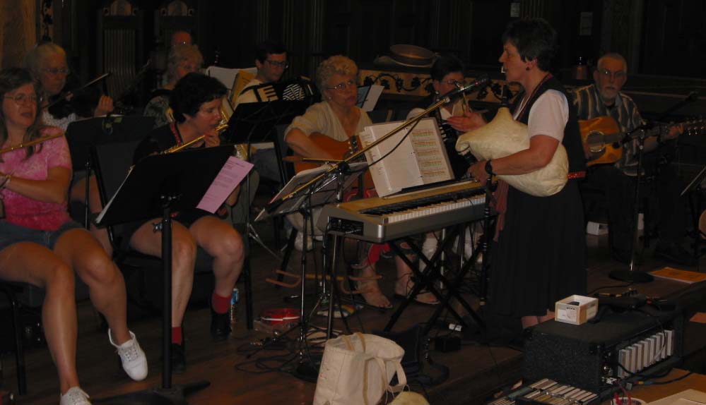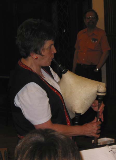 Sue Anderson wails on the gaida (Balkan single-drone bagpipe) while John Matulis